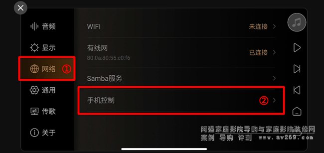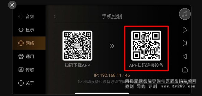 2、如搜索選項選項不顯示DMP-A6,請從DMP-A6 觸屏主界面依次進(jìn)入設(shè)置 - 網(wǎng)絡(luò) - 手機(jī)控制選項等待,如手機(jī)還沒安裝艾索洛遙控器,可使用手機(jī)瀏覽器掃描該選項下左側(cè)二維碼下載安裝