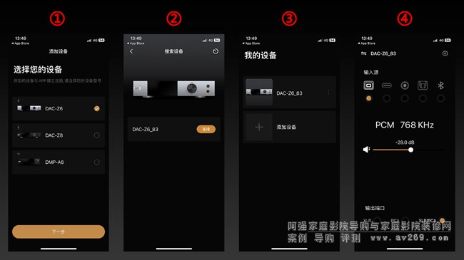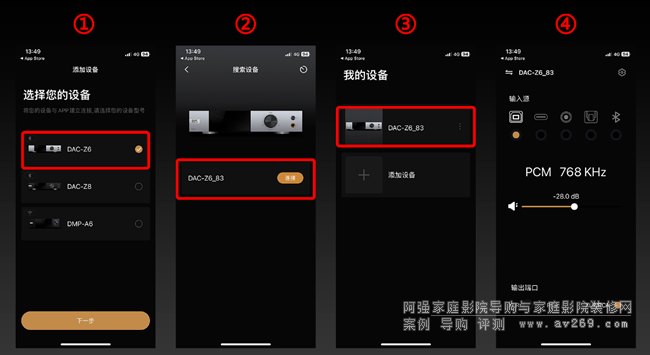 3、蘋果手機(jī)Eversolo控制器主界面根據(jù)您的機(jī)型,點(diǎn)選DAC-Z6 / DAC-Z8 下一步,然后等待軟件掃描,當(dāng)出現(xiàn)解碼器型號后點(diǎn)擊添加,當(dāng)出現(xiàn)圖例4即表示配對完成
