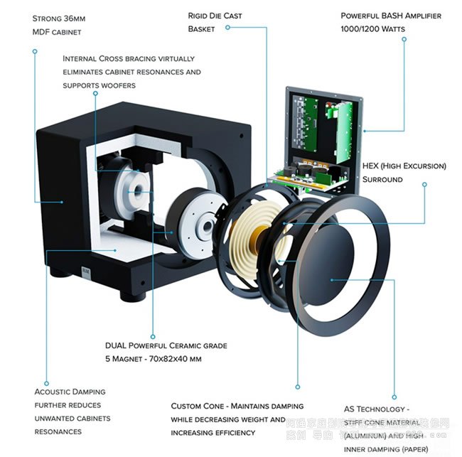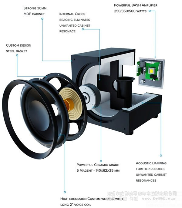 所有Varro系列超低音都使用到定制單元,包含大口徑音圈,它們與BASH放大器緊密配合。這其中,Premium子系列配備有2英寸口徑的音圈,Reference和Dual Reference子系列遞增到2.5英寸,以承受更高的功率負(fù)載和更快地化解由此產(chǎn)生的熱量。
