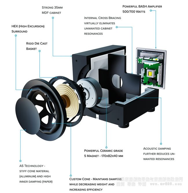 自Premium的子系列起,Varro超低音都使用到高效、性能強(qiáng)勁的BASH放大器。它能實(shí)時(shí)跟蹤電壓變化,提供驅(qū)動(dòng)單元在工作范圍內(nèi)所需的功率,包括額外的動(dòng)態(tài)功率。相對(duì)傳統(tǒng)超低音,ELAC這一系列新品因此在同等狀態(tài)下可輸出更高和更精準(zhǔn)的聲壓。