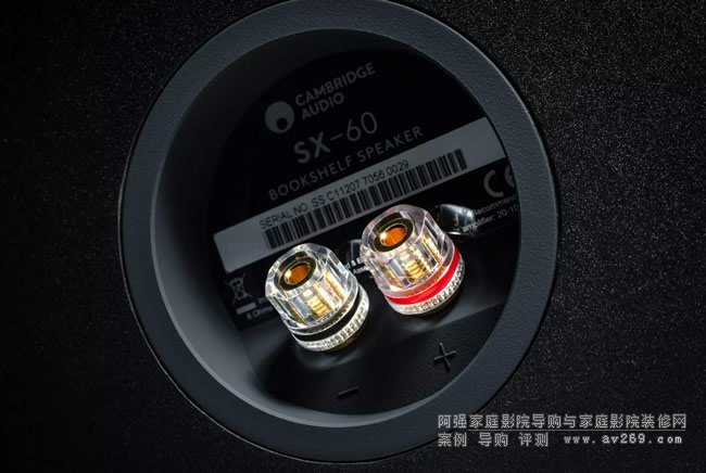 SX60對細節的關注從前到后貫穿始終。低音揚聲器正下方有一個整潔的低音反射端口,它強調較低的頻率以提供豐富引人入勝的聲音。旋轉 SX60 以顯示一對高質量的揚聲器接線柱(連接器),可以接受粗大的揚聲器電纜 - 帶或不帶香蕉插頭。