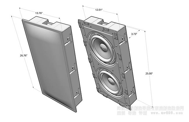 僅低音炮入墻式機柜尺寸 – 25“ (635mm) 高 X 12” (305mm) 寬 X 3.74“ (95mm) D
