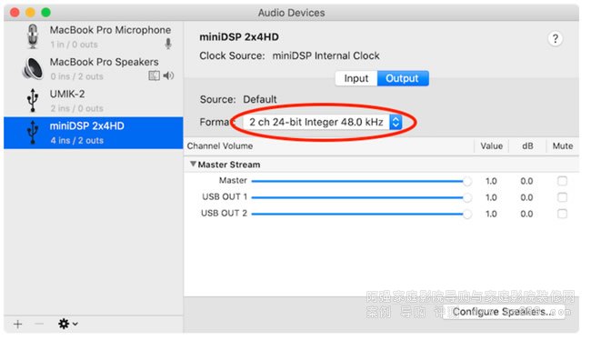 在macOS上,無需選擇驅動程序。以下是使用 miniDSP 2x4 HD 作為輸出設備的示例: