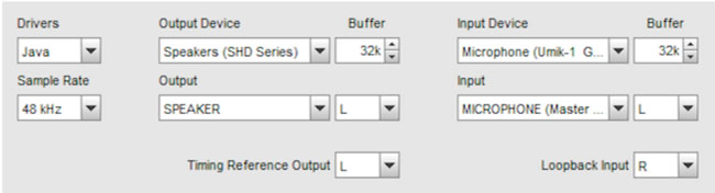 打開 REW 首選項窗口。選擇輸出設備,然后選擇 UMIK-1 或 UMIK-2 作為輸入設備。在 Windows 上,使用 Java 驅動程序(這應該是默認值)。將采樣率設置為與上面設置的相同。以下是使用miniDSP SHD作為輸出設備的示例: