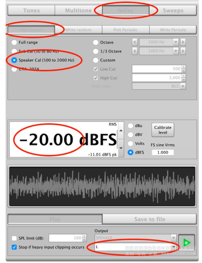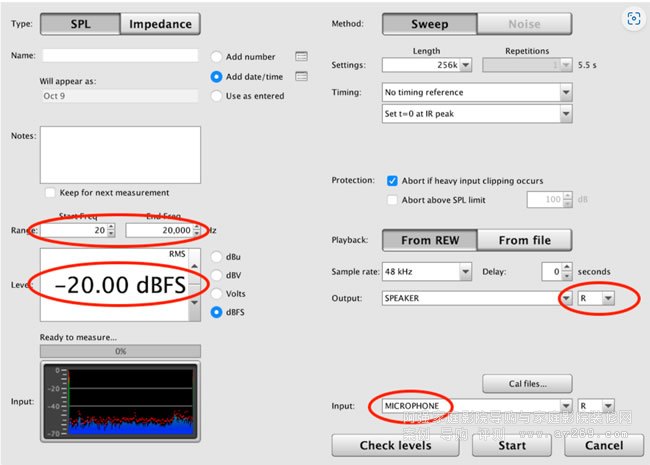 檢查電平是否設置為與信號發生器中使用的電平相同(在我們的示例中為 –20)。將頻率范圍設置為 20 到 20,000 Hz,并檢查輸出通道是否為所需的輸出通道。點擊檢查級別。只要沒有任何錯誤,請單擊“開始”。
