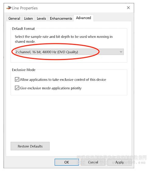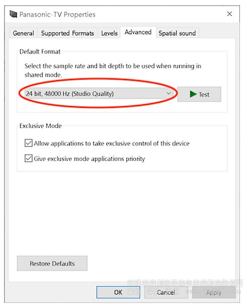 打開“控制面板”,然后打開“硬件和聲音”,然后打開“管理音頻設備”。在“播放”選項卡上,單擊HDMI設備,然后單擊“屬性”。下拉選擇器以設置采樣率。(請注意,AVR 可能不會按其預期名稱顯示。例如,即使您的電腦已連接到 AVR,它也可能顯示為電視的名稱。這是由于EDID造成的。