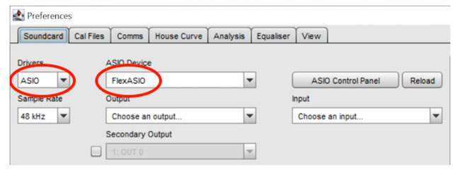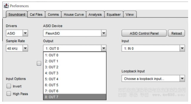 選擇輸入設備(在我們的示例中為 UMIK-1)和多通道輸出設備(在我們的示例中為“我的 AVReceiver”)。單擊“關閉面板并更新配置文件”按鈕。在 REW 首選項窗口中,單擊 Reload 以便 REW 檢測新的 I/O 配置,然后下拉輸出通道選擇器: