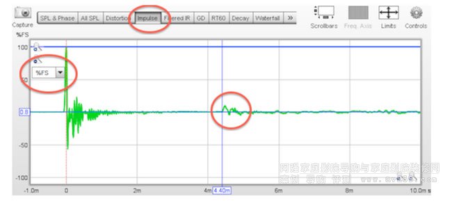 讓我們看看是否可以在示例測(cè)量中看到第一個(gè)反射。在 REW 主窗口中,單擊“脈沖”按鈕,然后將鼠標(biāo)懸停在顯示屏上并選擇“%FS”下拉列表(您可能需要調(diào)整圖形限制才能很好地查看脈沖響應(yīng)):