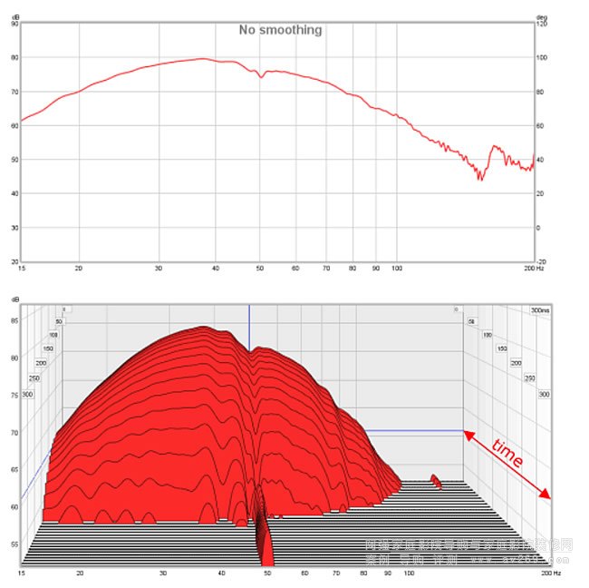 您可以在兩個圖中看到您在消聲室中看到的結果,這是一種非常平滑的響應,具有非常均勻和快速的衰減。您可能會說這是一個理想的瀑布圖。您還可以看到一些將PC連接到音響系統時發出的主電源嗡嗡聲。它很容易選擇,因為它發生在 50 Hz 并且它是連續的,沒有衰減的跡象。