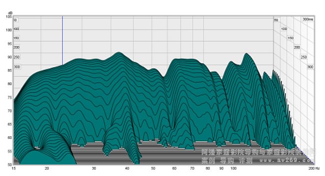 它們的衰減圖顯示了一個 2D 版本,其中響應以時間間隔繪制,在本例中為 150 毫秒。現在,讓我們看一下包含房間響應的瀑布量。與以前的測量不同,這包括低音炮和電源。