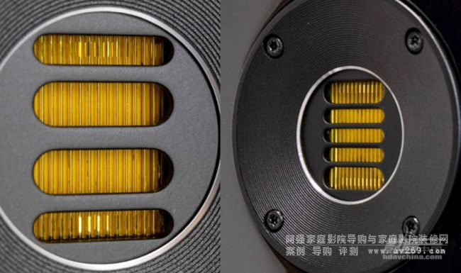 VELA 407.2是2.5路設計,使用兩只180mm(7英寸)直徑的AS-XR黑水晶振膜單元,一只負責中低頻播放,播放2.4KHz以下的聲音頻率,另一只負責低頻播放,播放450Hz以下的聲音頻率。如此以來,2只7英寸直徑的AS-XR黑水晶振膜單元在450Hz以下的聲音頻率都是重疊的,再通過隱藏在底部的倒相管,讓低頻能延伸到30Hz。而且AS-XR黑水晶振膜單元獨特的水晶切削面設計,還有包括鋁合金層、阻尼層、紙基纖維層組成的三明治結構,讓音盆有足夠的剛性而減少工作中產生的形變。