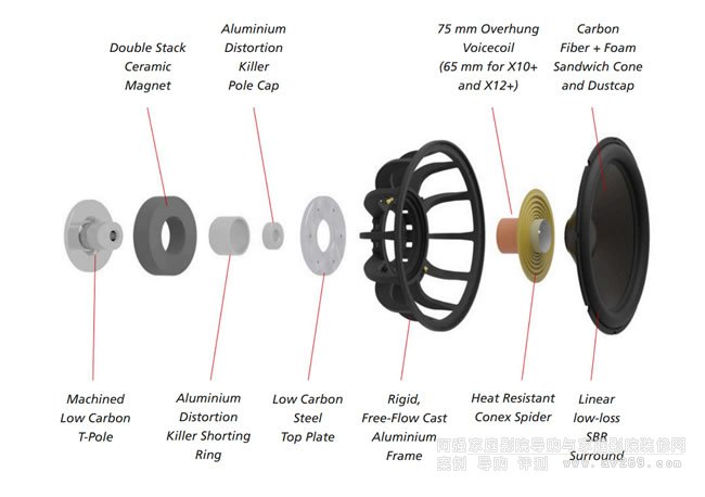 X10+的音圈是繞制在無磁性的鋁音圈筒﹐夠輕﹑夠硬也利于散熱﹐音圈繞組長度為47mm ·單體運作時的最大沖程為±18mm ·沖程這么大·真的推得動很多空氣(量感就強)。但是真正能不能推出更強的量感還是跟功放電路有尖∶先前的X10內建額定功率300瓦的功放電路﹑峰值功率600瓦﹐新款的X10+則是配備D類功放名門ICEpower的模組﹐額定功率500瓦﹑峰值功率1000瓦·相較上一代制品高出4成之多。