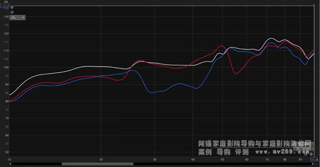 把結構說完﹐進入實際測試階段﹐這次有兩支X10+可以用﹐我就比照一般玩家在沒有用儀測輔助擺位的狀態·完全沒用任何試聽擺位技巧﹐按照M&K原廠的雙超低音擺位建議∶第一支超低音喇叭擺在墻角﹐第二支靠在側墻(前后在距離前墻或后墻全長的1/3處)﹐下圖是在聆聽位置測得的頻響曲線︰紅線是在墻角的X10+·藍線是側墻的﹐白線是兩支超低同時發聲測得的頻響曲線。