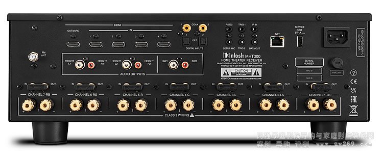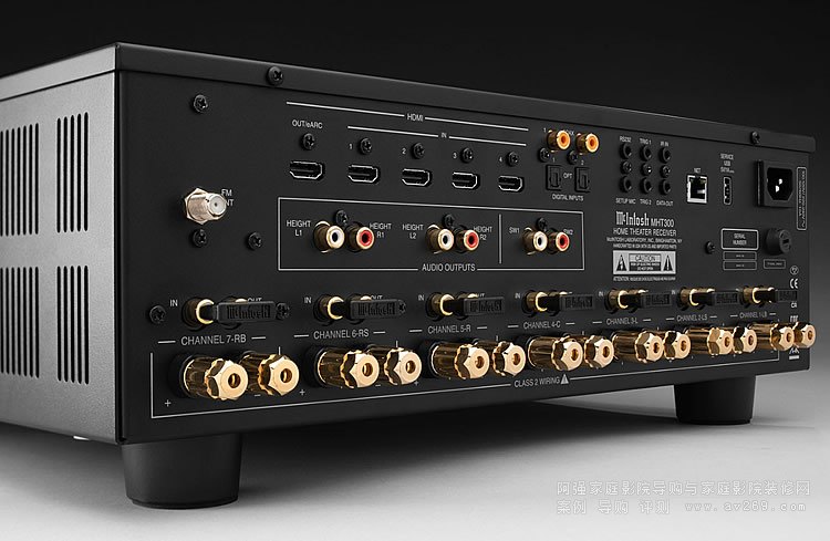 進行擴展 MHT300 還可以與您的影院一起成長,因為它的單個放大器模塊可以通過多種方式進行配置,以適應您的特定揚聲器配置。如果有一天您的家庭影院擴展到七個聲道以上,可以將額外的外部放大器連接到 MHT300,通過高度 1 和高度 2 音頻輸出為它們供電。外部放大器,例如 McIntosh MI254 4 聲道放大器,將連接到這些輸出以驅動這些額外的揚聲器。這將有效地將 MHT300 變成 7.2.4 聲道 AVR。