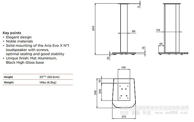 這些支架高24” (60.3 cm),專為Aria Evo X N°1揚聲器設計,可將固定在黑色光滑金屬板上的揚聲器抬升高度,進行展示。作為可額外選購的配件,這些啞光黑色鋁制支架包含一個電線通道,讓您實現最佳耦合,讓安裝更加隱蔽。支架造型時尚,十分穩固,還搭配了一個優雅、黑色光澤的鋼化玻璃底座。