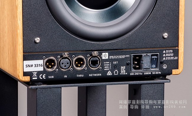 在安裝支架和音箱的時候,我注意到音箱的電源插座上面標識1000W,電源保險絲使用10A規格。為什么要那么大的功率?不如先看看8C內部的功放配置。首先,8C是三分頻的設計。其中,高音是1英寸鋁鎂合金半球頂高音單元,就這么一個小高音單元居然配置了250W的功放!中低音是8英寸的鋁膜中低音單元,同樣配置了250W輸出功率的功放,背部的2只超低音單元同樣是8英寸的鋁膜超低音,負責100Hz以下頻率的聲音播放。可以看到這倆單元的折環都特別厚,沖程也長,然后再這兩只超低音配置500W功放,每只音箱的最大總功率就是1000W!至于內置功放方面就使用丹麥Pascal的D類功放模塊。其實這么一個配置,在家庭環境里面完全屬于超規格使用。如果用來組建個家庭影院環繞聲音響,超低音音箱只需要播放LFE音軌即可,低音管理功能基本就是多余的,因為8C完全可以作為全頻音箱使用。