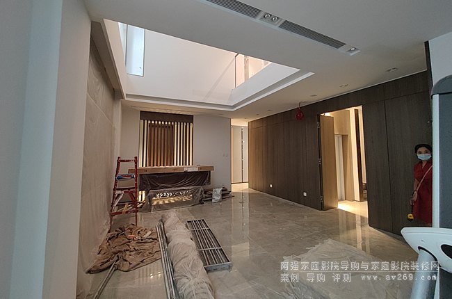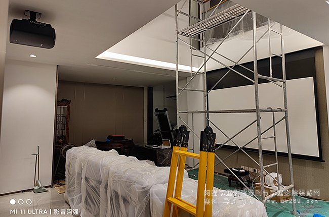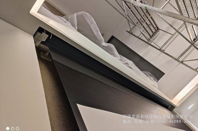 上圖我們就可以看到整個投影幕嚴絲合縫,整個投影幕槽呈凹凸形狀,即凹于墻體也凸于邊棚,最外沿只有薄薄的一個立面,完工后的整體并不突兀,但前期溝通成本和施工量均增加了不少。