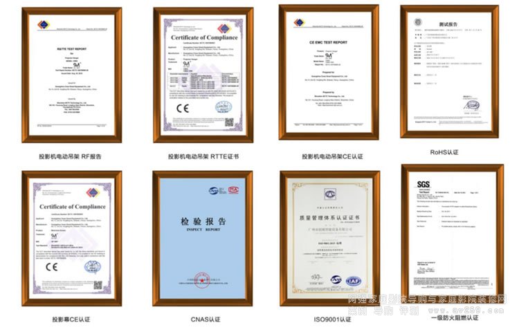 企業本身除了對研發上的持續投入與專注,還嚴格遵循ISO質量體系的要求。每一支投影幕、電動吊架和吊點產品都是經由有10年以上經驗的技師精心制作而成。我們承諾旗下產品提供長達兩年的非人為損壞保修和終身維護。我們企業在環境保護和員工健康上也相當重視,因此我們旗下所有產品所使用的材料都符合環保要求。例如中國的CNAS質量認證、SGS防火認證、游離甲醛釋放量環保標準和ROSH環保標準。
