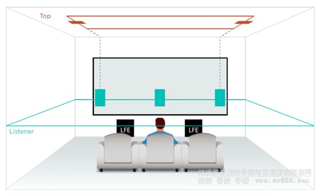 最小的杜比全景聲3.1.2揚(yáng)聲器布局,僅有3個前置揚(yáng)聲器與2個上層/頭頂揚(yáng)聲器