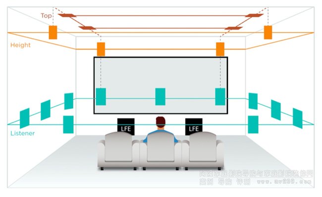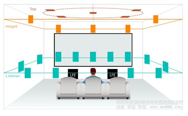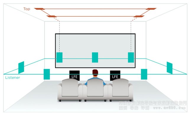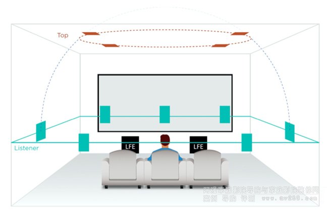 杜比全景聲7.1.4揚(yáng)聲器布局,包括4個與前置左右揚(yáng)聲器處于同一垂直平面的上層/頭頂揚(yáng)聲器