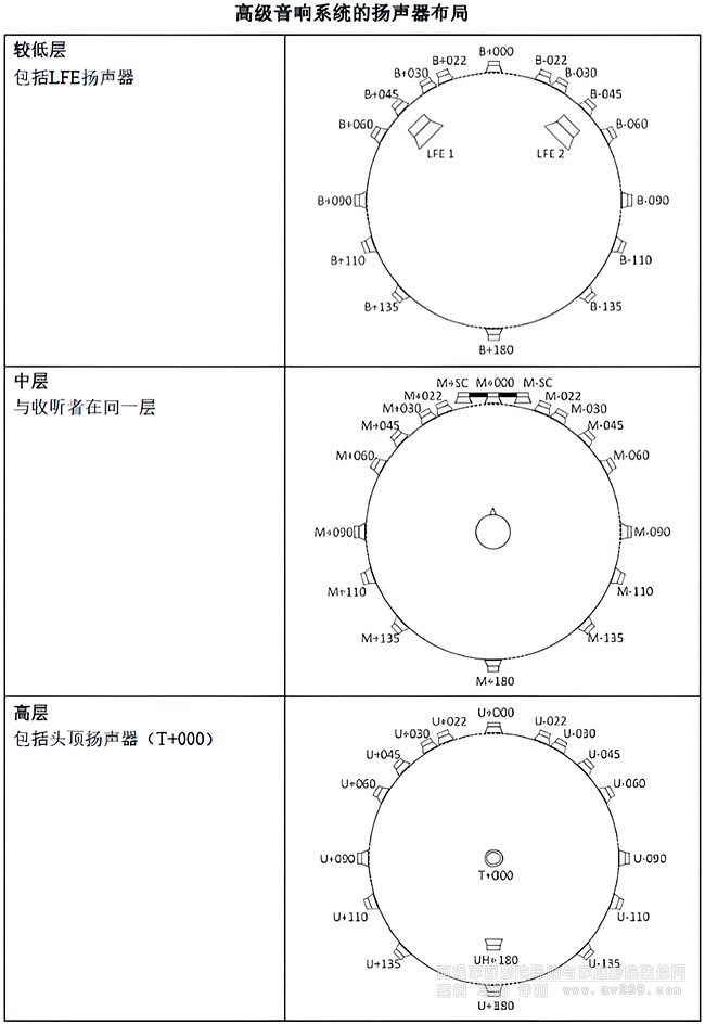 MPEG-H 3D Audio關(guān)于高級音響系統(tǒng)的揚(yáng)聲器布局,具體包括3層,分別是較低層(包括LFE揚(yáng)聲器)、中層(與聆聽者同一層)、高層(包括頭頂揚(yáng)聲器)