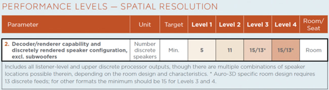 RP22推薦規(guī)范對于沉浸式音效系統(tǒng)聲像空間分辨率的性能要求如圖,等級1需要配備5個獨(dú)立揚(yáng)聲器,也就是3.1.2;等級2需要配置11個獨(dú)立揚(yáng)聲器,也就是7.1.4;等級3和等級4為13或15個獨(dú)立揚(yáng)聲器,其中Auro-3D系統(tǒng)為13通道,其余格式則至少需要15通道
