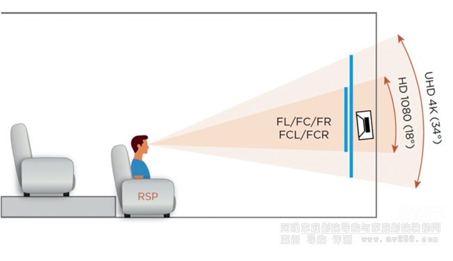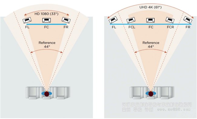 各種不同的沉浸式音效格式分別推出了關(guān)于屏幕揚(yáng)聲器水平角度的推薦范圍,左右揚(yáng)聲器與RSP之間的夾角介于44°到60°之間。這個范圍與SMPTE美國電影電視工程師協(xié)會關(guān)于電影投影推薦視角(43°)、UHD 4K數(shù)字視頻的推薦最大視角(61°)以及2聲道音樂重現(xiàn)的最佳角度(60°)非常接近。