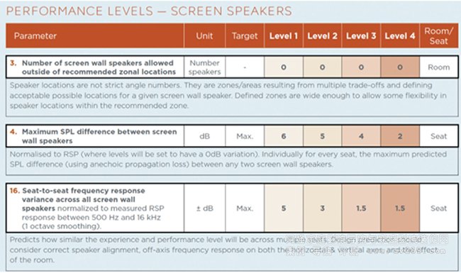 屏幕揚(yáng)聲器的性能指標(biāo),包括屏幕揚(yáng)聲器之間的聲壓級差異,以及座位間屏幕揚(yáng)聲器的頻響差異性等