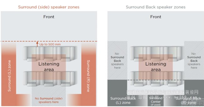 側(cè)環(huán)繞(左)與后環(huán)繞(右)揚(yáng)聲器放置區(qū)域的建議