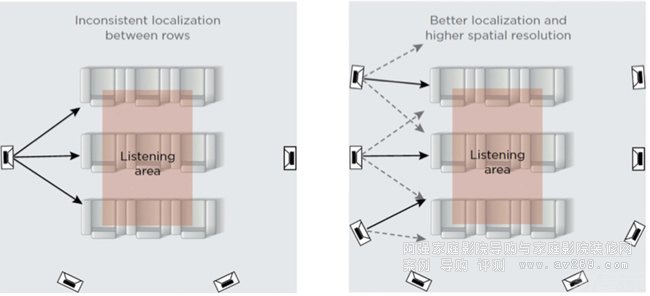增加側(cè)環(huán)繞的數(shù)量(右圖)將能在座位間獲得更高的聲像空間分辨率