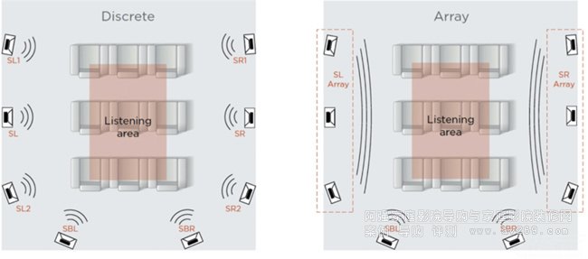 獨(dú)立環(huán)繞揚(yáng)聲器通道配置(左)對比陣列側(cè)環(huán)繞揚(yáng)聲器(右)