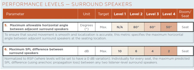 環(huán)繞聲揚(yáng)聲器的性能指標(biāo),包括最大可允許的相互間的水平角度以及相互間的聲壓級差異