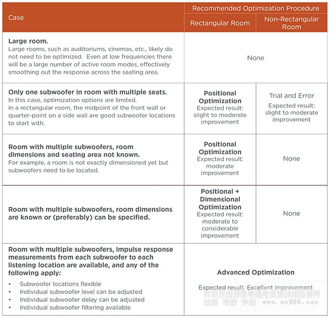 在選擇優化方法時,可以充分考慮表以下列表的幾個因素。以下表格為各種情況的優化提供了相應的建議,其中涉及小房間(住宅)內使用多只低音炮和多個座位的情況。