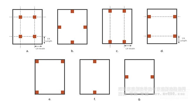 上圖顯示了在矩形房間中2只或4只低音炮的7種布置方式。這些配置按照對多個座位位置的效果從最佳(a)到良好(g)的順序排列,其中四只低音炮通常優于兩個