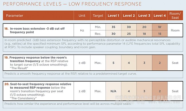 上圖為低頻響應的性能等級判斷,包括房間內低頻下潛頻率、房間過度頻率響應、座位間相對參考聆聽位置頻響差異性