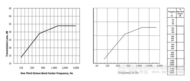 ●傳聲等級(STC)- 美國ASTM E413標準化的評級,STC是一個整數,用于評定125Hz-4kHz范圍內,1/3倍頻程或全倍頻程的傳聲損失,權重中心頻率為500Hz。