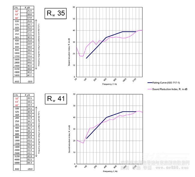 上圖顯示了使用SRI標準測量兩扇單門的示例,Rw數值差異很大(35對比41)。高于曲線表示在那些頻率更好的減聲效果,而低于曲線表示相對參考值,減聲效果較差。但是,觀察每個對應的測量圖表可見,這兩個樣本在160Hz以下的范圍內差不多。由此可見,如果僅僅關注低頻部分的隔聲效能,更高的Rw數值效能并不一定更好。
