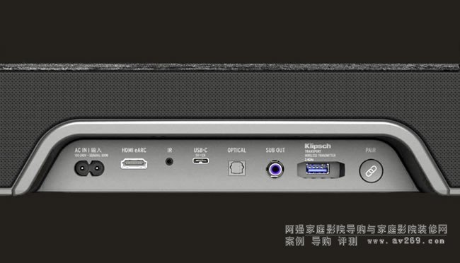 這是位于Flexus Core 100與Core 200聲霸背面的接線板,由左至右分別為電源線輸入端口、HDMI eARC對應端子、IR紅外線接收、USB-C端子、光纖數字輸入端口、超低音有線輸出RCA連接端子、Klipsch Flexus Transmitter無線傳輸USB端口、藍牙配對按鍵等。