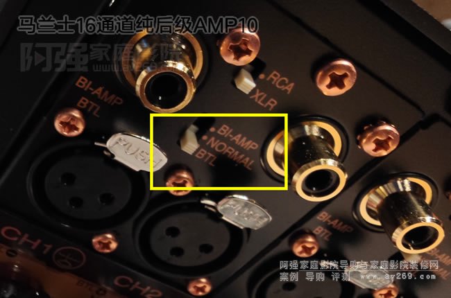 信號(hào)的輸入選擇及輸出方式也是多樣,根據(jù)需要選擇同軸或平衡音頻信號(hào)接入,同時(shí)驅(qū)動(dòng)方式在這里也可以選擇,Bi-AMP雙通道驅(qū)動(dòng)如雙中置、雙線分音等,還有BTL橋接大功率驅(qū)動(dòng),對(duì)于最高功率設(shè)置,BTL模式可以將8歐姆的2x200W立體聲放大器轉(zhuǎn)換為400W的單聲道放大器。雙放大器的電路結(jié)構(gòu)保證了出色的信噪比和對(duì)任意揚(yáng)聲器的完全控制。