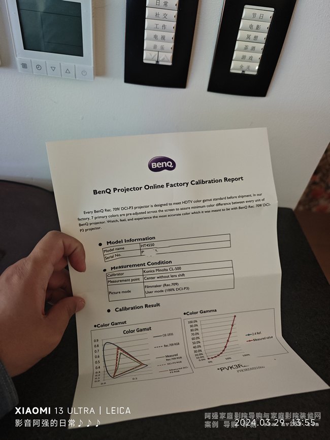 原來使用六年的投影機除了亮度,分辨率低外其他均正常,在咨詢阿強安裝的時候阿強推薦了明基最近剛推出的色準導演機,最重要的四點非常符合現在客廳空間使用,即4K超高清分辨率、中短焦投射距離滿足現在110英寸畫面的投射、擁有4LED長效光源和3200流明的亮度,尤其是亮度的提升可以在如此明亮的客廳空間可以舒適觀影,而明基HT4550的出廠校準出色,可以在夜晚體驗到更加真實的影像色彩。隨機附帶原廠校正報告書和機身序列號綁定,確保Delta E<3,開箱即用。