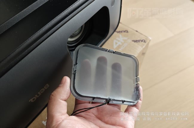 明基HT4550投影機明基HT4550投影機鏡頭為6組10片鏡頭組,投射比在1.15到1.5之間,在100英寸投影機鏡頭到幕面直線距離為2.55米到3.3米之間,注意在實際計算距離中需要把投影幕的點用的空間和投影機深度及后面插線的轉彎半徑加上,一般HDMI視頻線約占用6公分,有條件的話計算10公分即可。y這款機器的鏡頭蓋的方形的,有異于常規投影機的圓形,而特別之處是明基設計的這款鏡頭蓋安裝是和機身接觸并穩固,而不需要固定在鏡頭上,這樣的好處就是不會和鏡頭接觸,避免畫面跑焦。畫面的聚焦和大小調整均需要手動調整,調整好后把小蓋拉上防止誤觸,做為家庭影院投影機對于畫質的要求很高,盡量少用梯形校正功能,明基這款提供水平士15%和垂直+60%無損位移鏡頭功能,可以滿足大部分空間調整需求。