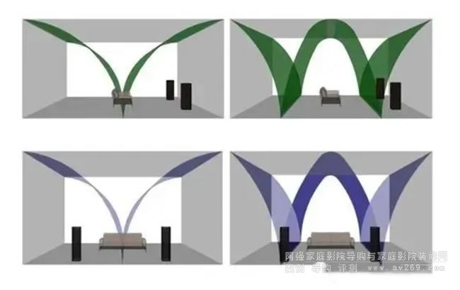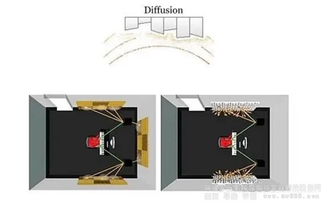圖片說明是將擴(kuò)散板放置于兩側(cè)靠中間的墻面上,減少由主喇叭直接打在左右兩側(cè)墻壁上反射的聲音。