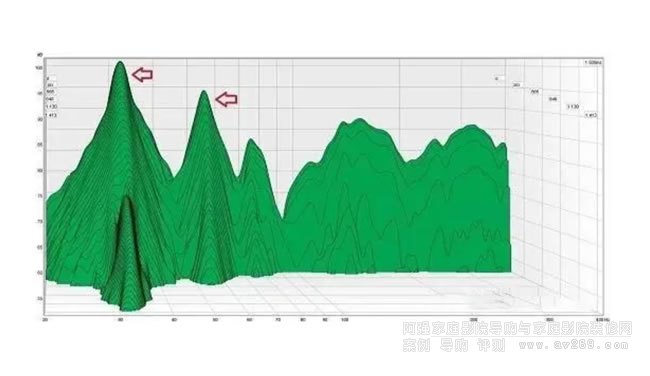 駐波實(shí)際上是共振頻率,其具有較小的摩擦并因此具有較長的混響時(shí)間。這意味著房間將“庇護(hù)”駐波,結(jié)果是不受控制的低音能量。顯示兩個(gè)駐波的瀑布劇情