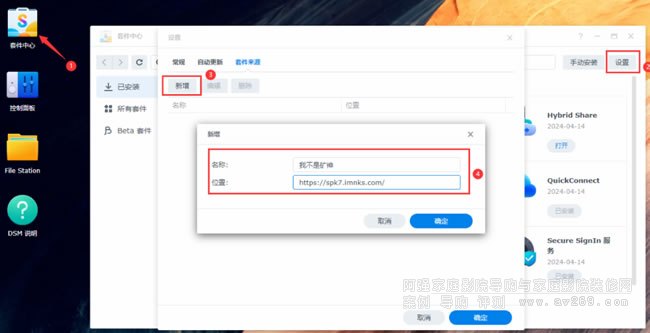 1、電腦瀏覽器登錄群暉WEB頁面,進入套件中心 - 設置 - 新增下列礦神群暉套件源地址,添加完成點擊確定保存