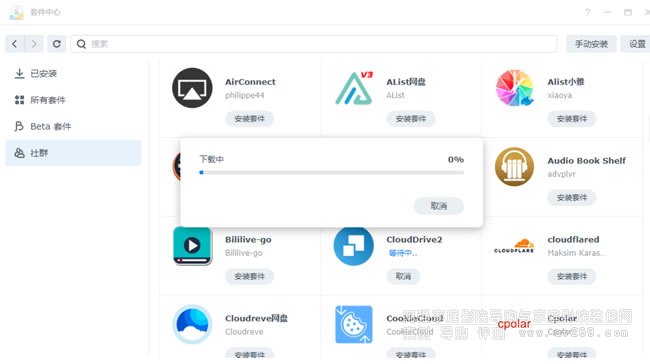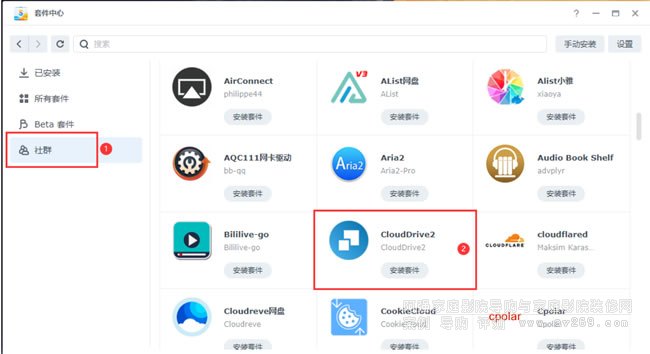 2、套件中心左側選項進入社群,然后滑動右側菜單找到CloudDrive2套件