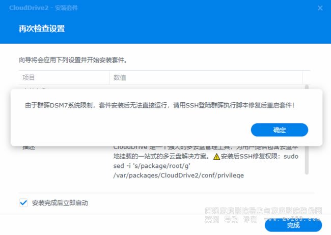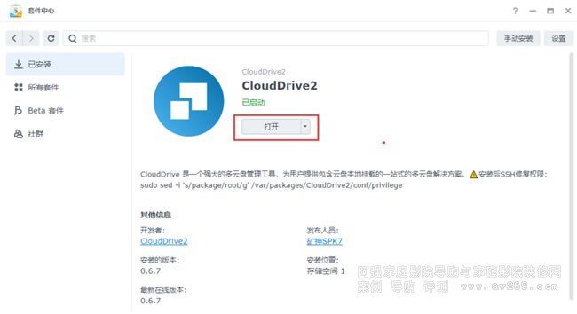3、點擊CloudDrive2下面的安裝套件按鈕,群暉會在線下載并安裝,如果你的群暉有多個磁盤,請自定義選擇安裝位置