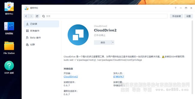 8、最后進入群暉套件中心 - 已安裝 - 啟動CloudDrive2,當軟件提示已啟動說明之前腳本配置沒問題,如果啟動失敗請檢查之前的SSH腳本配置。