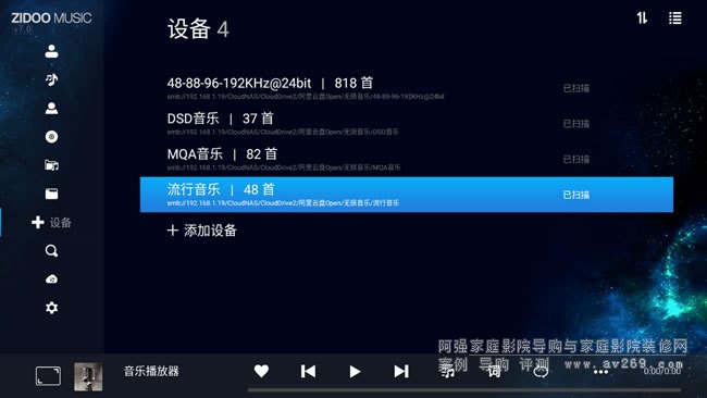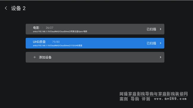 音樂播放器添加網盤音樂路徑,設備管理點擊添加 - 網絡SMB - 群暉CloudNAS/網盤視頻路徑,請等待刮削完成后再進行播放