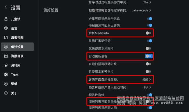 ●海報墻刮削網盤視頻建議進入設置 - 偏好設置 - 關閉mediainfo解析、自動更新、詳情頁面自動播放預告片與海報列表界面自動播放器原生音樂,能提高影片刮削速度以及播放穩定性,后期路徑加入新視頻需進入海報墻設備管理手動更新