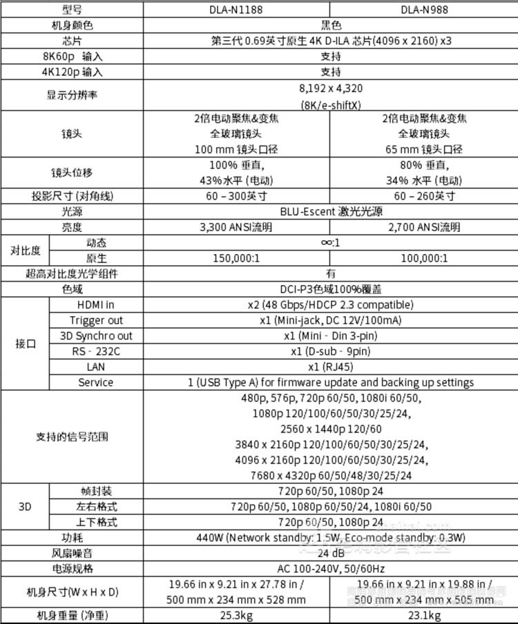 JVC DLA-N1188 采用 100 mm超大口徑全玻璃鏡頭組精準重現8K影像。JVC DLA-N1188采用了100mm超大口徑鏡頭組,由18片、16組全玻璃鏡片組成,采用全鋁鏡筒。為了將高分辨率8K圖像投影到屏幕的每個角落,同時確保100%垂直和43%水平的大鏡頭位移,投影機集成了五個針對R/G/B折射率差異進行校準的ED透鏡,以在透鏡位移時減少色差和色邊,從而確保4K或8K分辨率影像的精準再現。▪ DLA-N988 采用65mm口徑全玻璃鏡頭組再現8K影像極致細節DLA-N988采用了65mm大口徑鏡頭組,由17片、15組全玻璃鏡片組成,采用全鋁鏡筒,即使在屏幕的邊緣也可以實現高分辨率的圖像對焦。